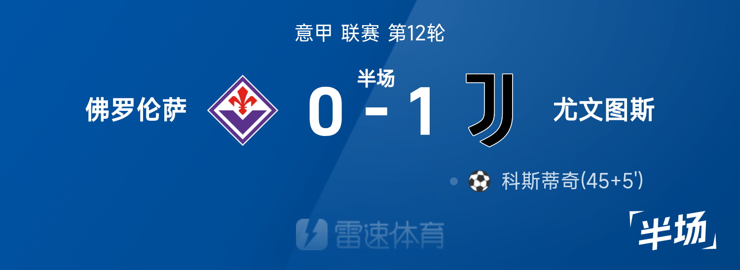 雷速體育11月23日訊 25/26賽季意甲聯(lián)賽第12輪,佛羅倫薩迎戰(zhàn)尤文圖斯。半場戰(zhàn)罷,雙方比分暫為佛羅倫薩0-1尤文圖斯,科斯蒂奇破門建功。