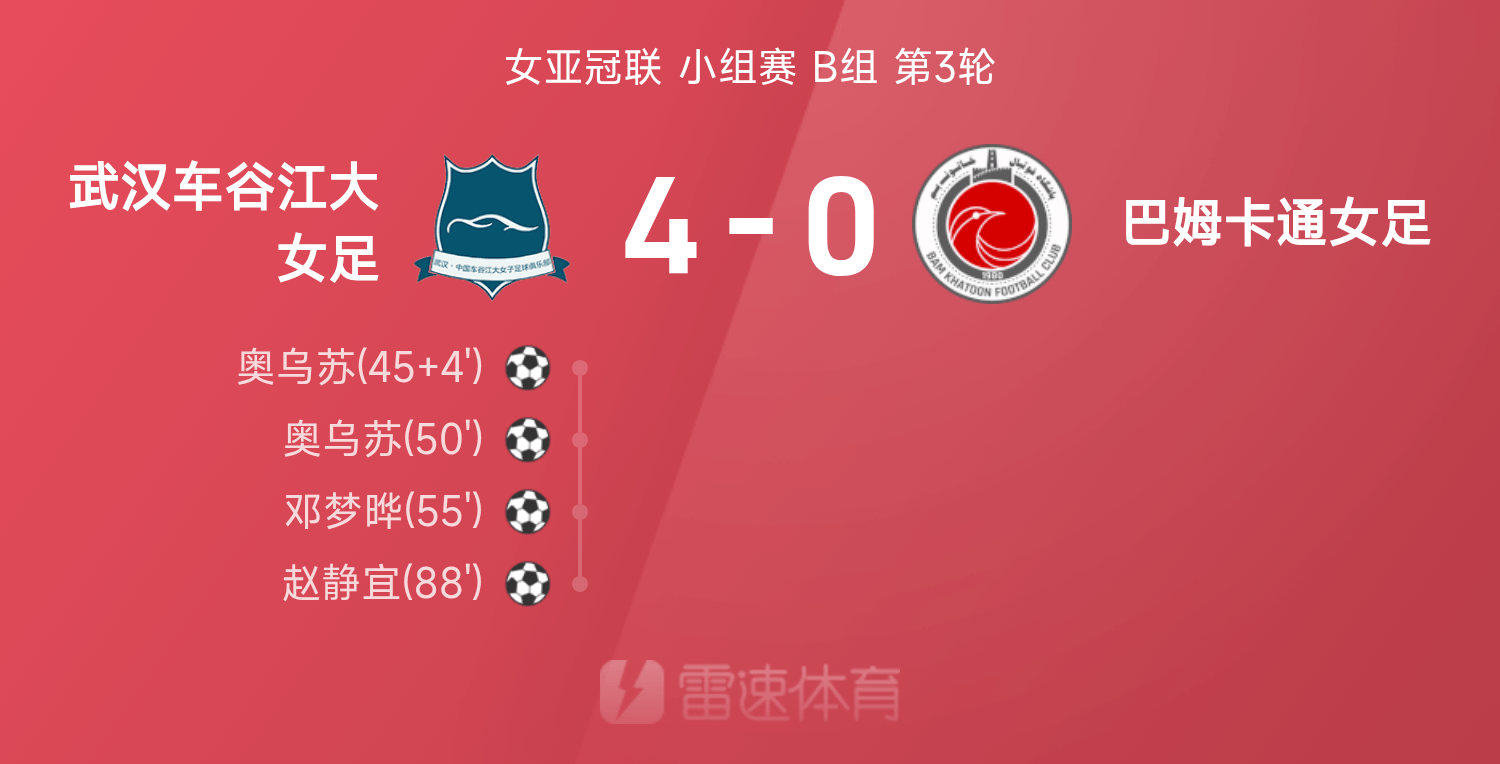 雷速體育11月23日訊 25/26賽季女亞冠聯(lián)小組賽B組第3輪,武漢車谷江大女足4-0戰(zhàn)勝巴姆卡通女足。全場比賽,奧烏蘇上演梅開二度,宋菲助攻雙響,鄧夢曄、趙靜宜破門建功。武漢女足以2勝1平的戰(zhàn)績,取得位列小組頭名晉級八強(qiáng)。