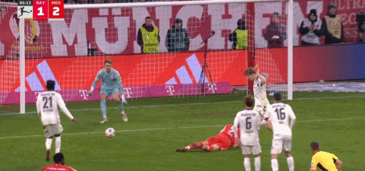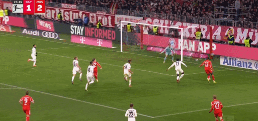 第45+2分鐘,伯溫開出任意球,波圖爾斯基頭球破門,美因茨1-1拜仁