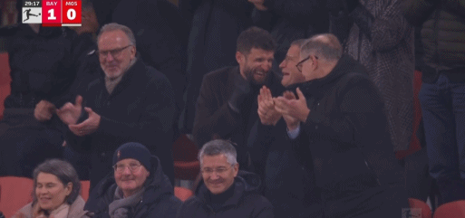 第29分鐘,拜仁進球后鏡頭給到看臺,穆勒和高層一起慶祝