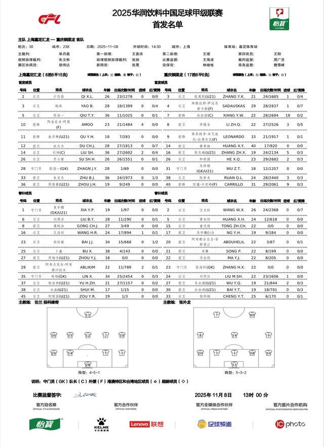 北京時間11月8日14:30,中甲第30輪的一場對決。上海嘉定匯龍坐鎮(zhèn)主場,迎戰(zhàn)重慶銅梁龍。賽前雙方的陣容公布如下: