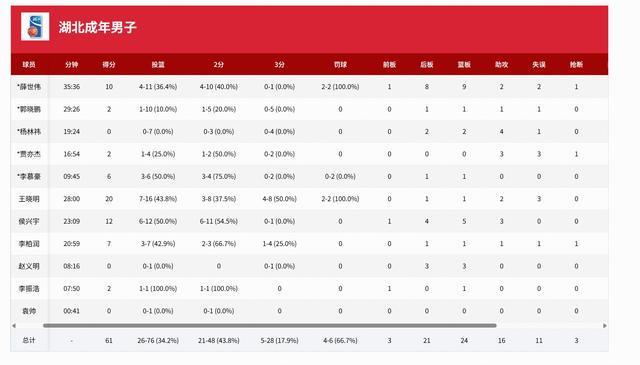 湖北男籃:王曉明20分1板2助、侯興宇12分5板3助、薛世偉10分8板2助、李柏潤(rùn)7分1助、李慕豪6分1板;