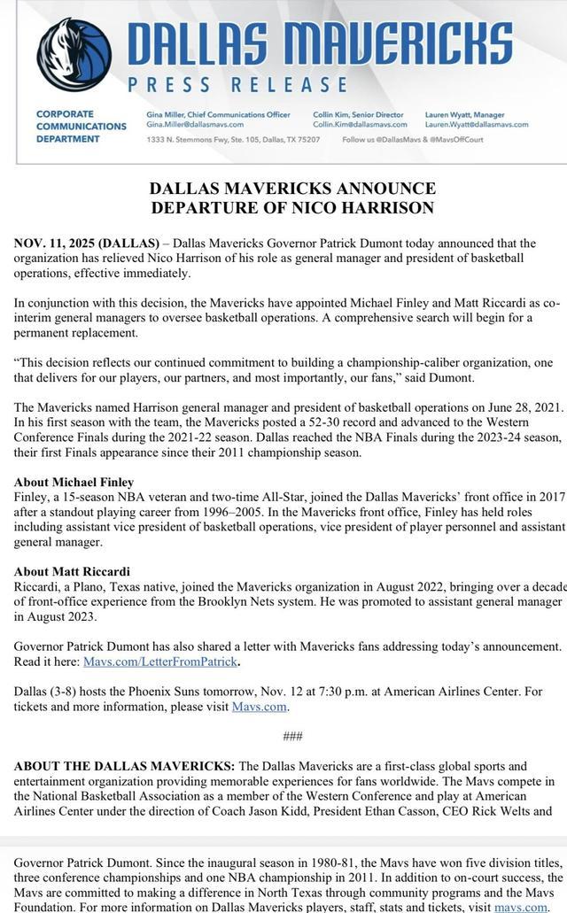 2025年11月11日,達拉斯獨行俠隊總裁帕特里克-杜蒙今日宣布,球隊已解除尼科-哈里森總經(jīng)理兼籃球運營總裁的職務(wù),即刻生效。與此同時,獨行俠隊任命邁克爾-芬利和馬特-里卡迪為聯(lián)合臨時總經(jīng)理,負責籃球運營。球隊將啟動全面的招聘流程,尋找哈里森的正式繼任者。