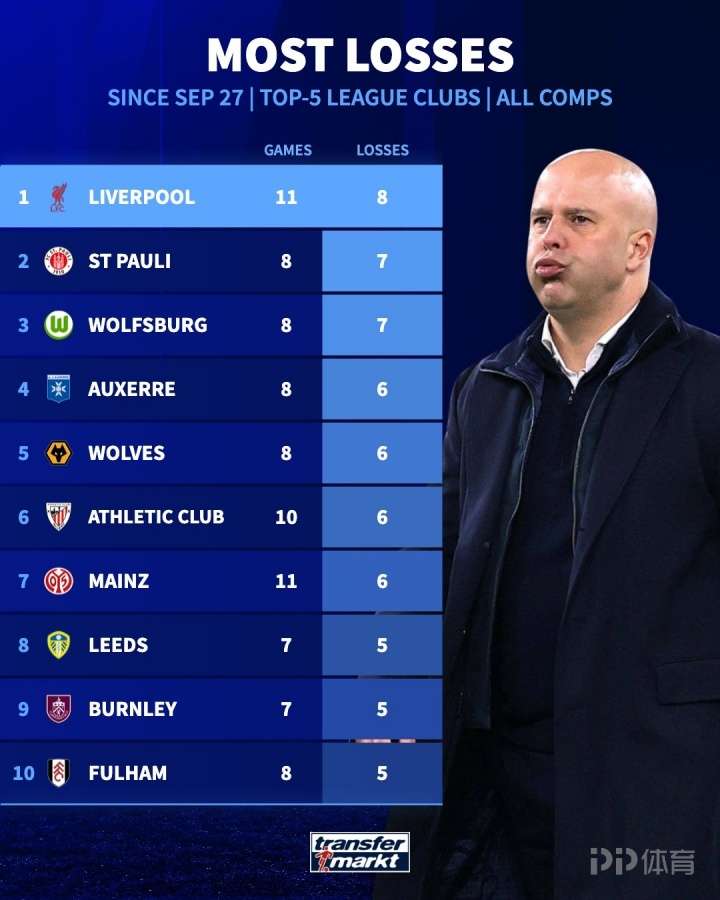利物浦是自9月27日以來五大聯(lián)賽輸球場數(shù)最多的球隊(duì)