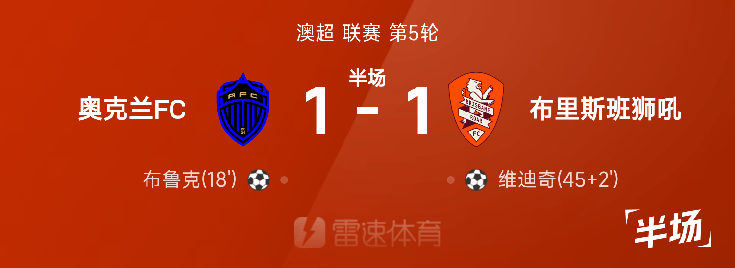 澳超半場(chǎng):維迪奇補(bǔ)時(shí)扳平,奧克蘭FC暫1-1布里斯班獅吼