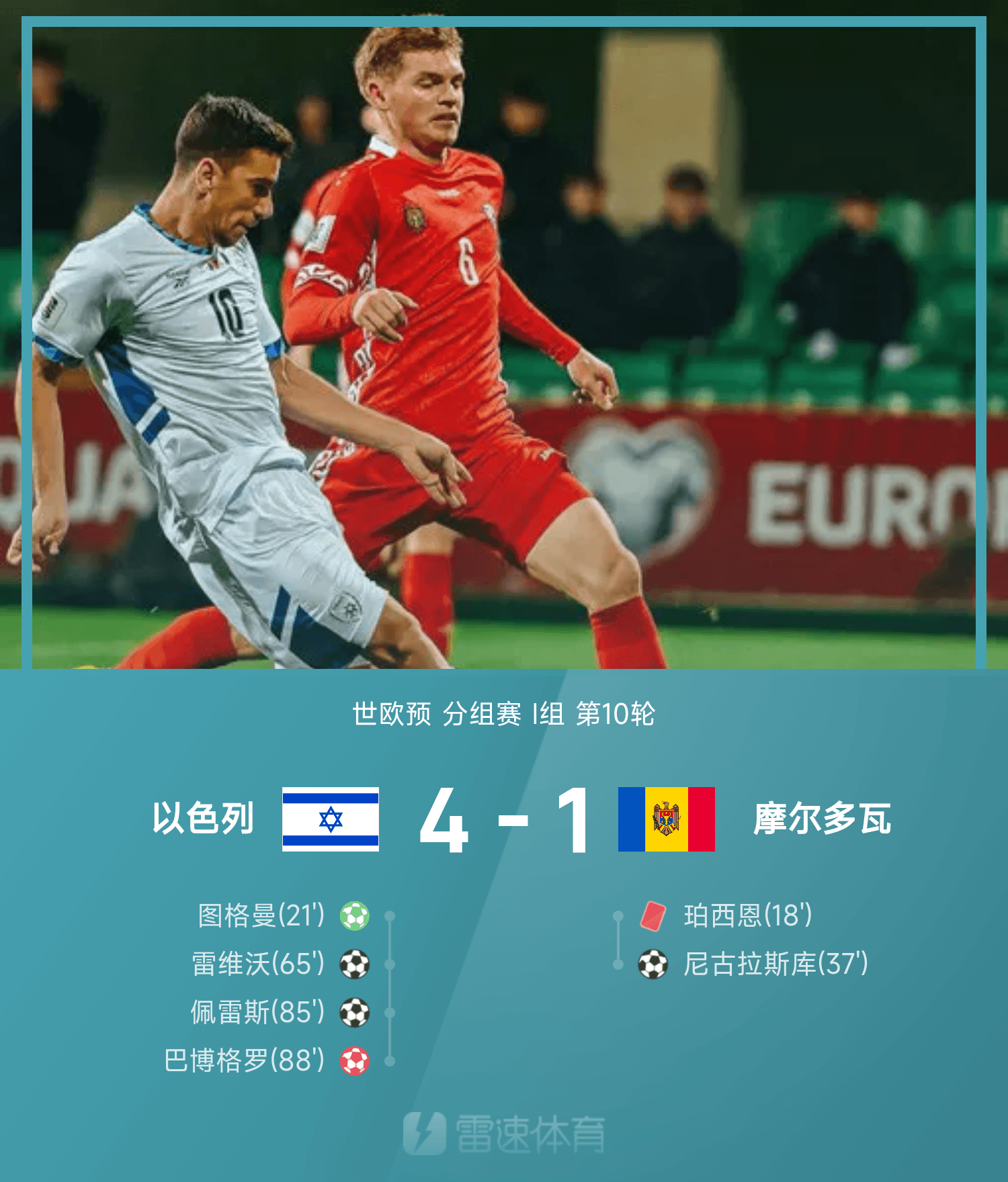 雷速體育11月17日訊 26賽季世歐預分組賽I組第10輪,以色列4-1戰(zhàn)勝摩爾多瓦。