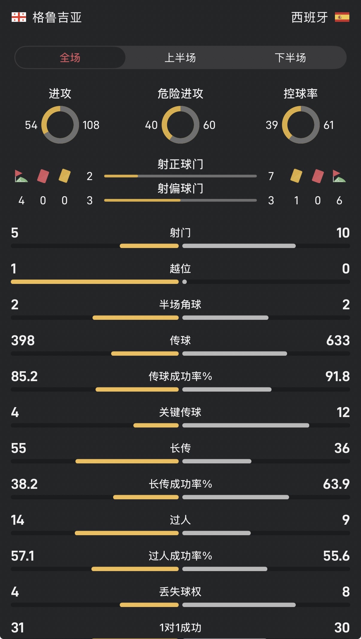 西班牙vs格魯吉亞全場:控球率61-39,射門10-5