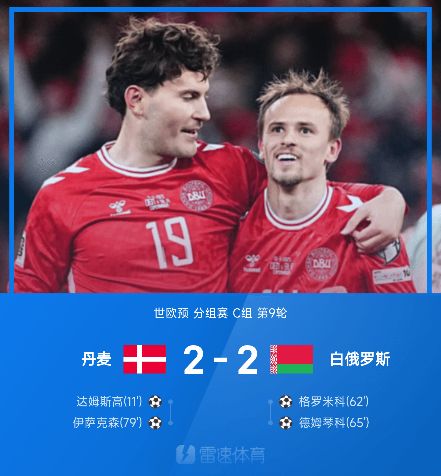 世歐預(yù)戰(zhàn)報:伊薩克森破門救主,丹麥2-2白俄羅斯