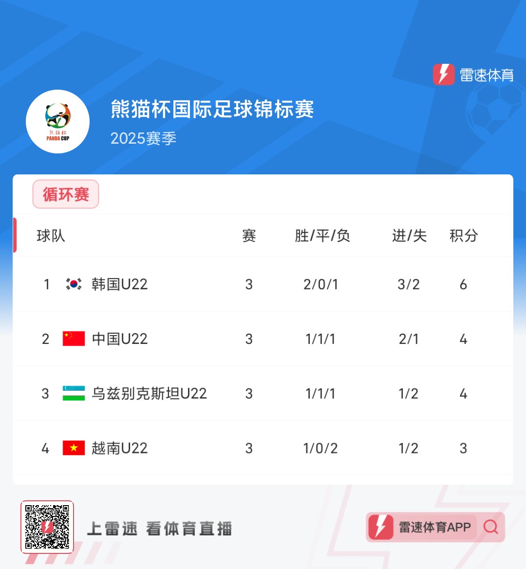 熊貓杯排名:韓國奪冠,U22國足凈勝球優(yōu)勢第二,越南墊底