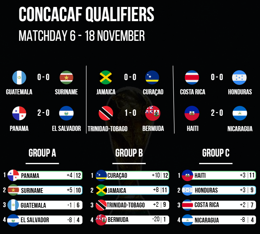 雷速體育11月19日訊 2026世界杯中北美區(qū)預(yù)選賽第三階段今日落幕,庫(kù)拉索力壓牙買加獲得小組第一,晉級(jí)美加墨世界杯正賽,也就此憑借以4
