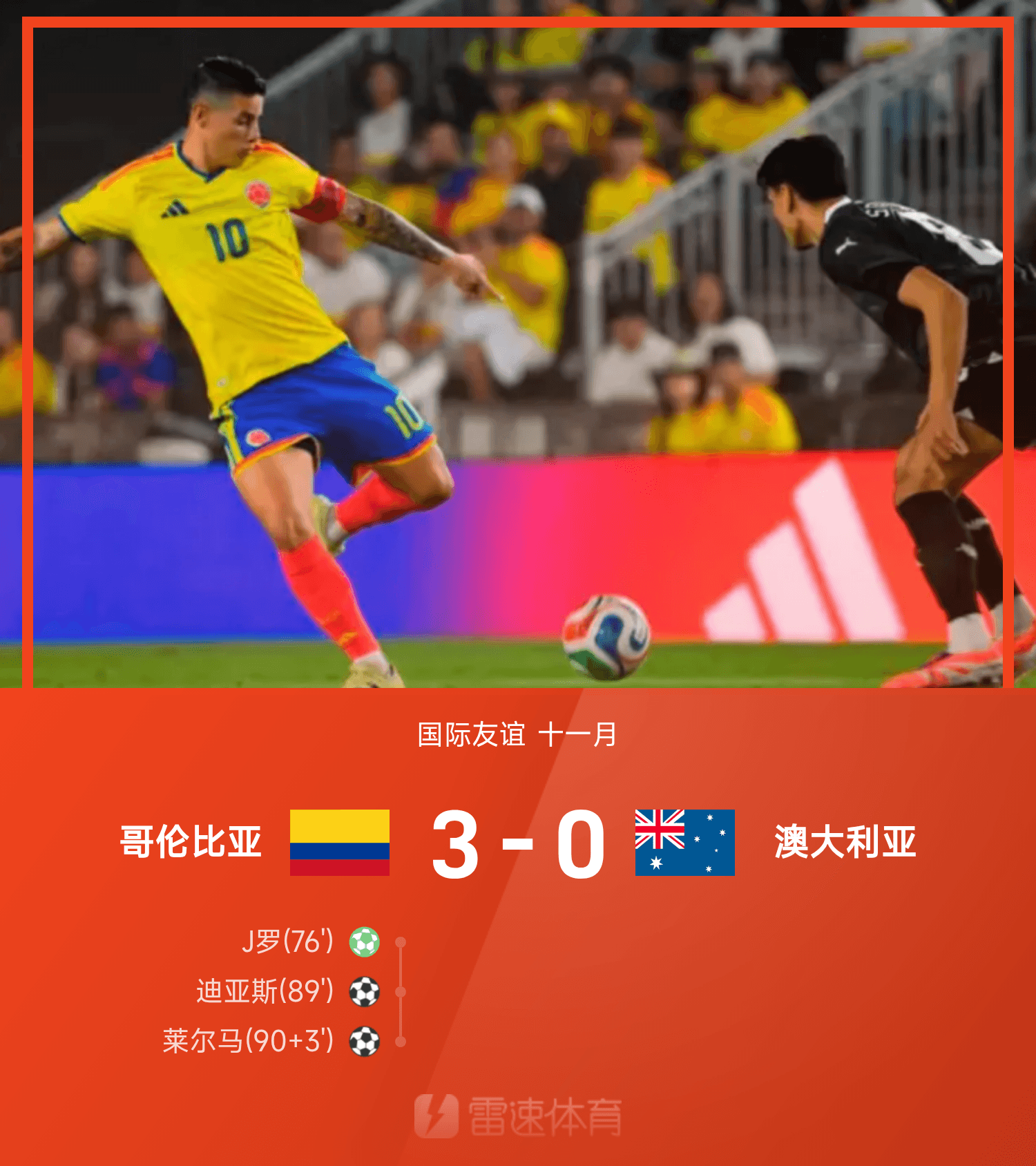 雷速體育11月19日訊 25賽季國(guó)際友誼十一月,哥倫比亞3-0戰(zhàn)勝澳大利亞。