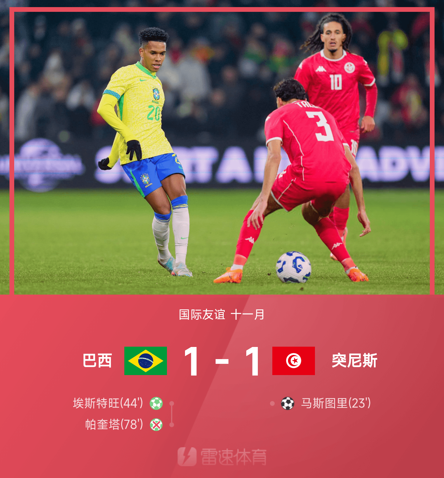 雷速體育11月19日訊 25賽季國(guó)際友誼十一月,巴西1-1戰(zhàn)平突尼斯。