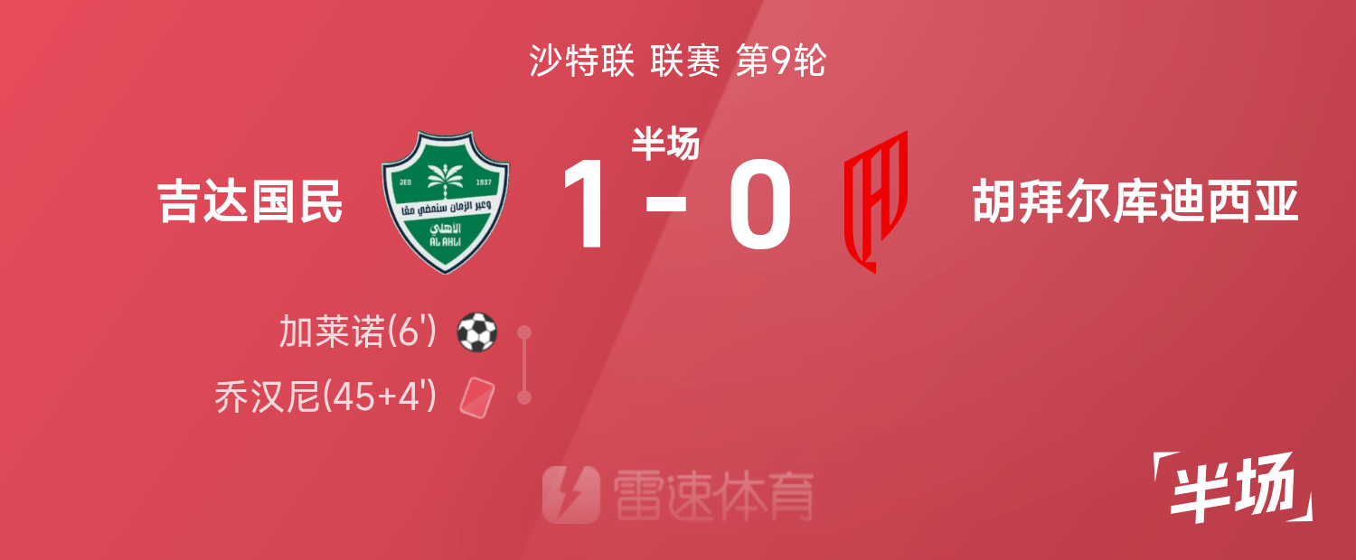 沙特聯(lián)半場:加萊諾建功,吉達國民暫1-0胡拜爾庫迪西亞