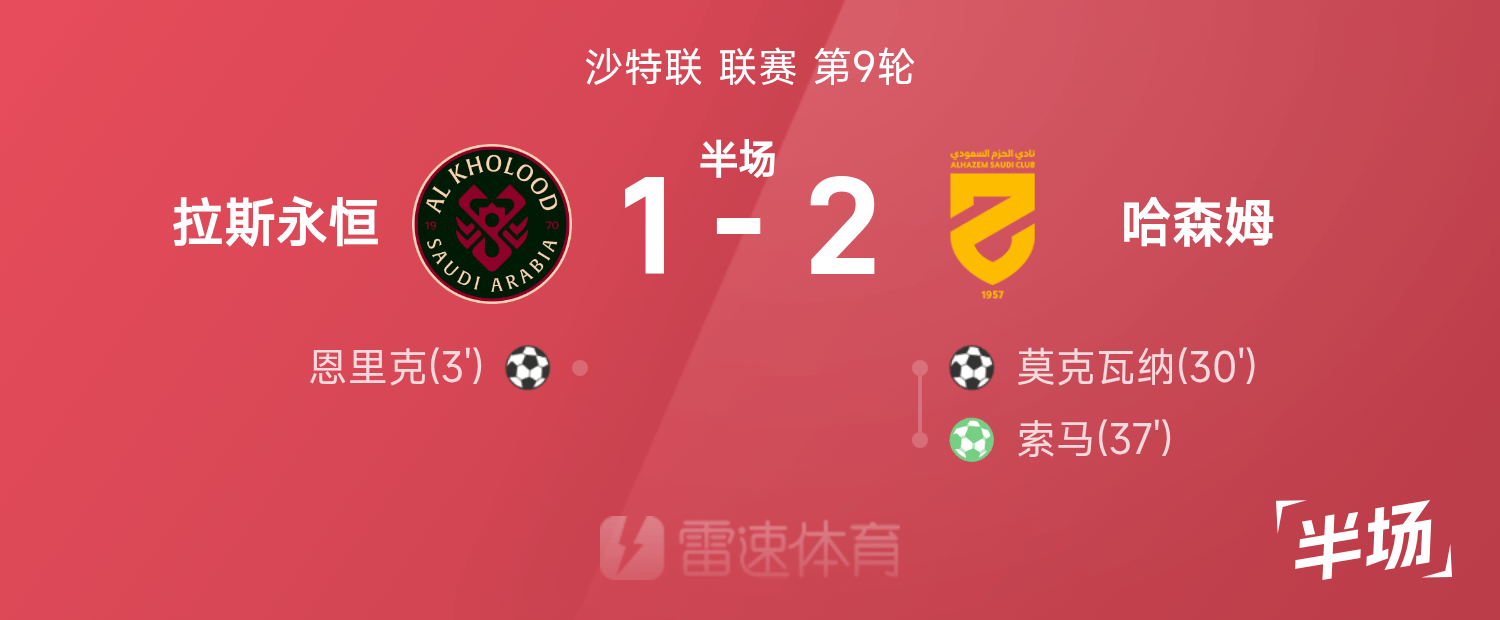 沙特聯(lián)半場:莫克瓦納造點+進球,哈森姆2-1拉斯永恒