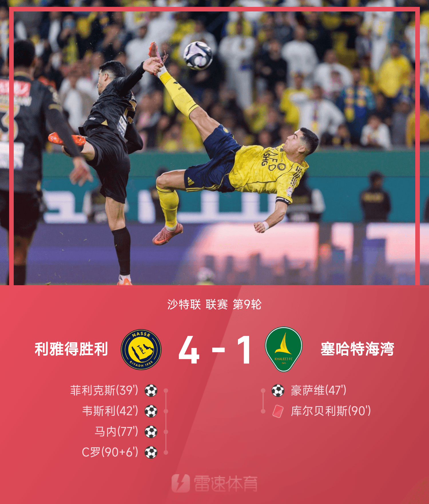 雷速體育11月24日訊 沙特聯(lián)第9輪,利雅得勝利主場以4-1大勝塞哈特海灣,C羅打入驚天倒鉤。