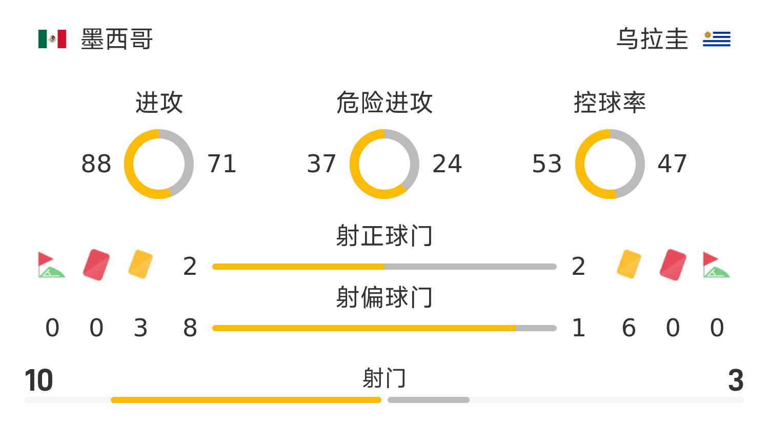 烏拉圭首發(fā)陣容:23-梅勒、13-巴雷拉、2-希門尼斯、16-奧利維拉、22-皮克雷斯、6-本坦庫爾、25-薩納布里亞(46’21-托雷斯)、10-扎拉扎爾(46’8-南德斯)、15-馬丁內(nèi)斯、7-阿吉雷、18-羅德里格斯(74’20-阿勞霍)