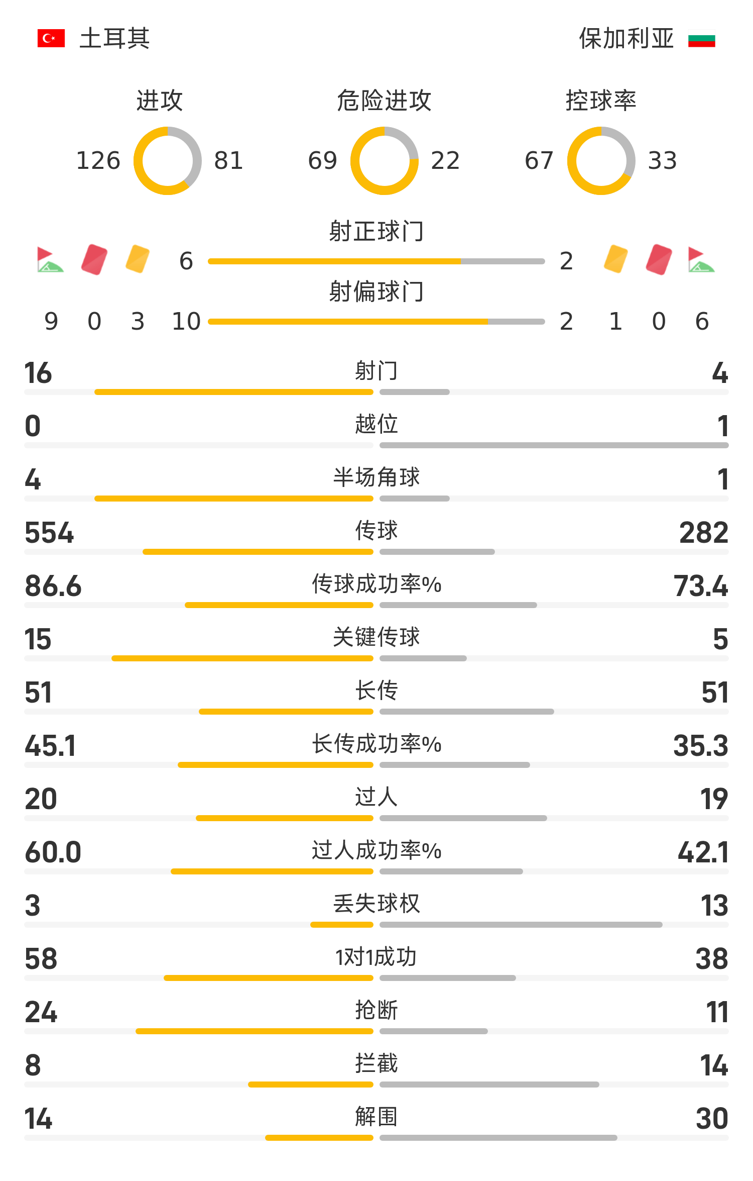 保加利亞首發(fā)陣容:1-米托夫、5-迪米特洛夫、3-切爾涅夫、2-佩特羅夫、20-格奧爾基耶夫、8-克拉夫(72’18-羅喬切夫)、7-魯塞夫(85’9-尼科洛夫)、10-迪米特洛夫(72’16-彼得科夫)、4-格魯夫、14-克拉斯特夫、11-德斯波多夫(63’17-明切夫)