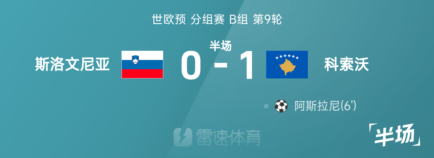 雷速體育11月16日訊 26賽季世歐預分組賽B組第9輪,斯洛文尼亞迎戰(zhàn)科索沃。半場戰(zhàn)罷,雙方比分暫為斯洛文尼亞0-1科索沃,阿斯拉尼破門建功。