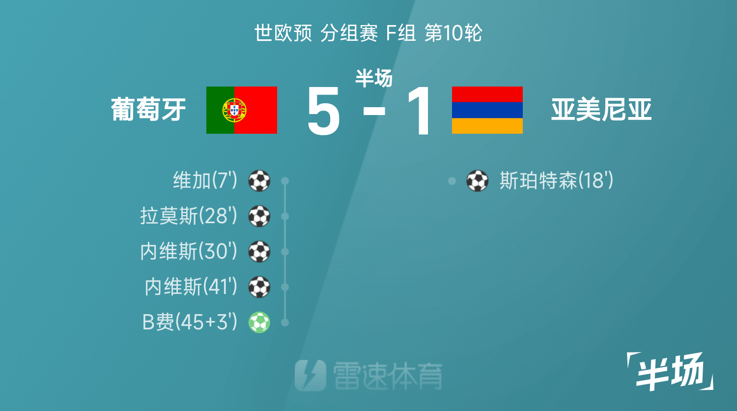雷速體育11月16日訊 26賽季世歐預分組賽F組第10輪,葡萄牙迎戰(zhàn)亞美尼亞。半場戰(zhàn)罷,雙方比分暫為葡萄牙5-1亞美尼亞,內(nèi)維斯上演梅開二度。