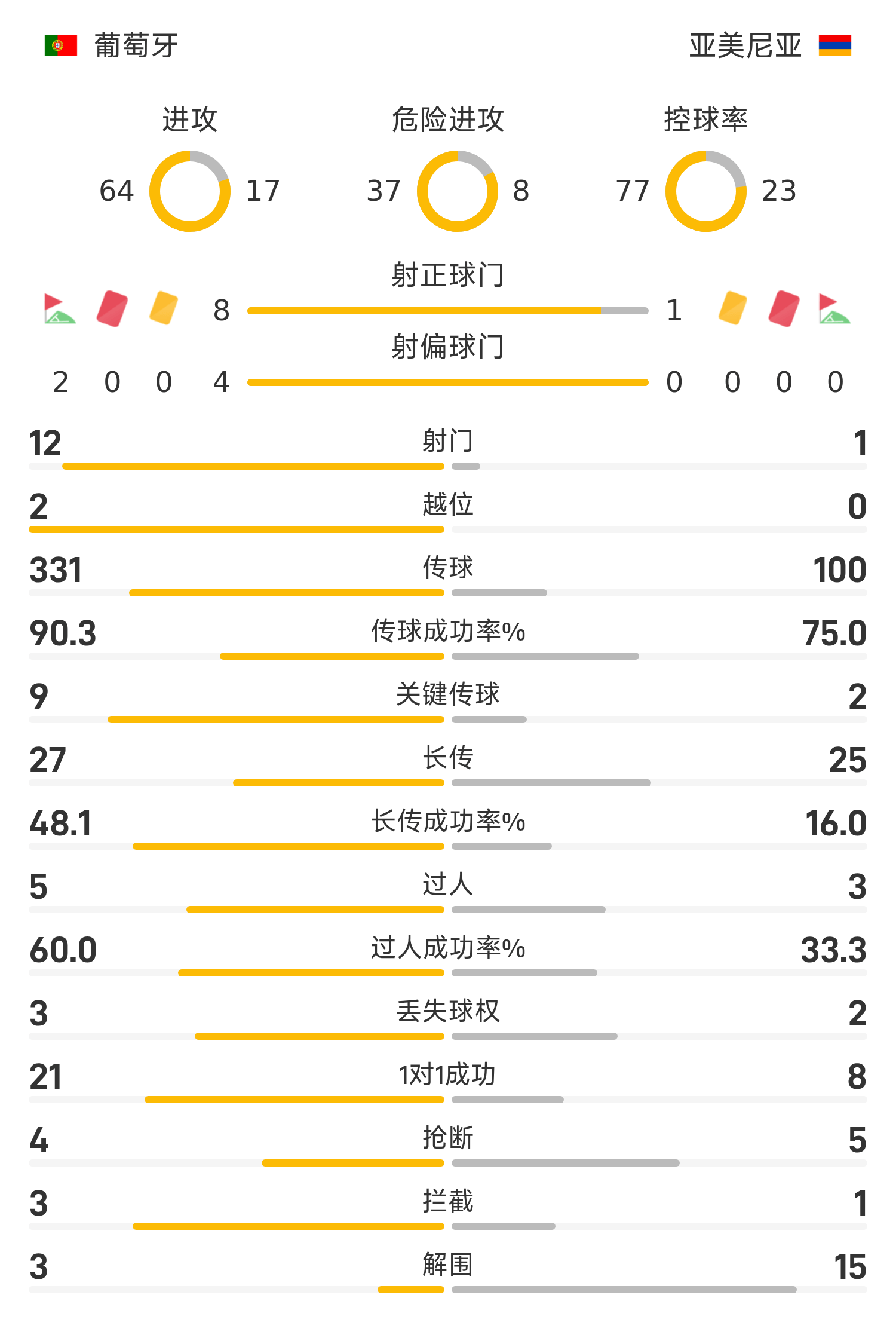 41’內(nèi)維斯主罰任意球直接破門完成雙響,葡萄牙4-1亞美尼亞