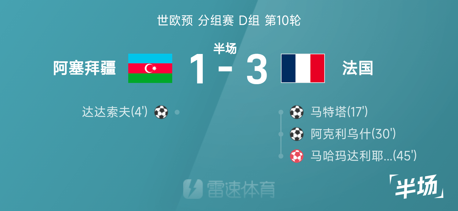 雷速體育11月17日訊 世歐預(yù)分組賽D組第10輪,阿塞拜疆坐鎮(zhèn)主場迎戰(zhàn)法國。此役上半場,達(dá)達(dá)索夫閃擊破門,馬特塔接應(yīng)古斯托傳中頭球扳平比分,阿克利烏什門前接應(yīng)古斯托橫傳推射建功,圖拉姆射門造對(duì)方門將馬哈瑪達(dá)利耶夫自擺烏龍。半場戰(zhàn)罷,法國3-1阿塞拜疆。