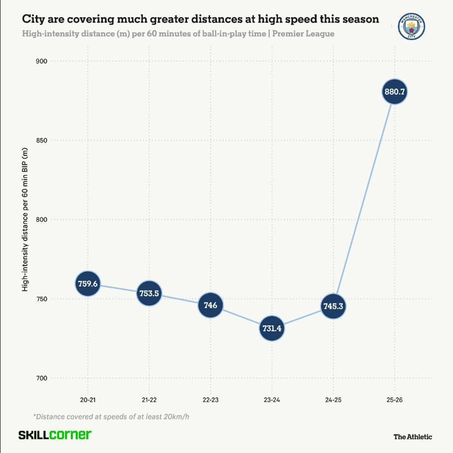 根據(jù)SkillCorner的追蹤數(shù)據(jù),曼城每60分鐘的高強度跑動距離(以20公里/小時或更高速度跑動)增加了約18.2%,這給核心球員群體帶來了額外的體能負擔。