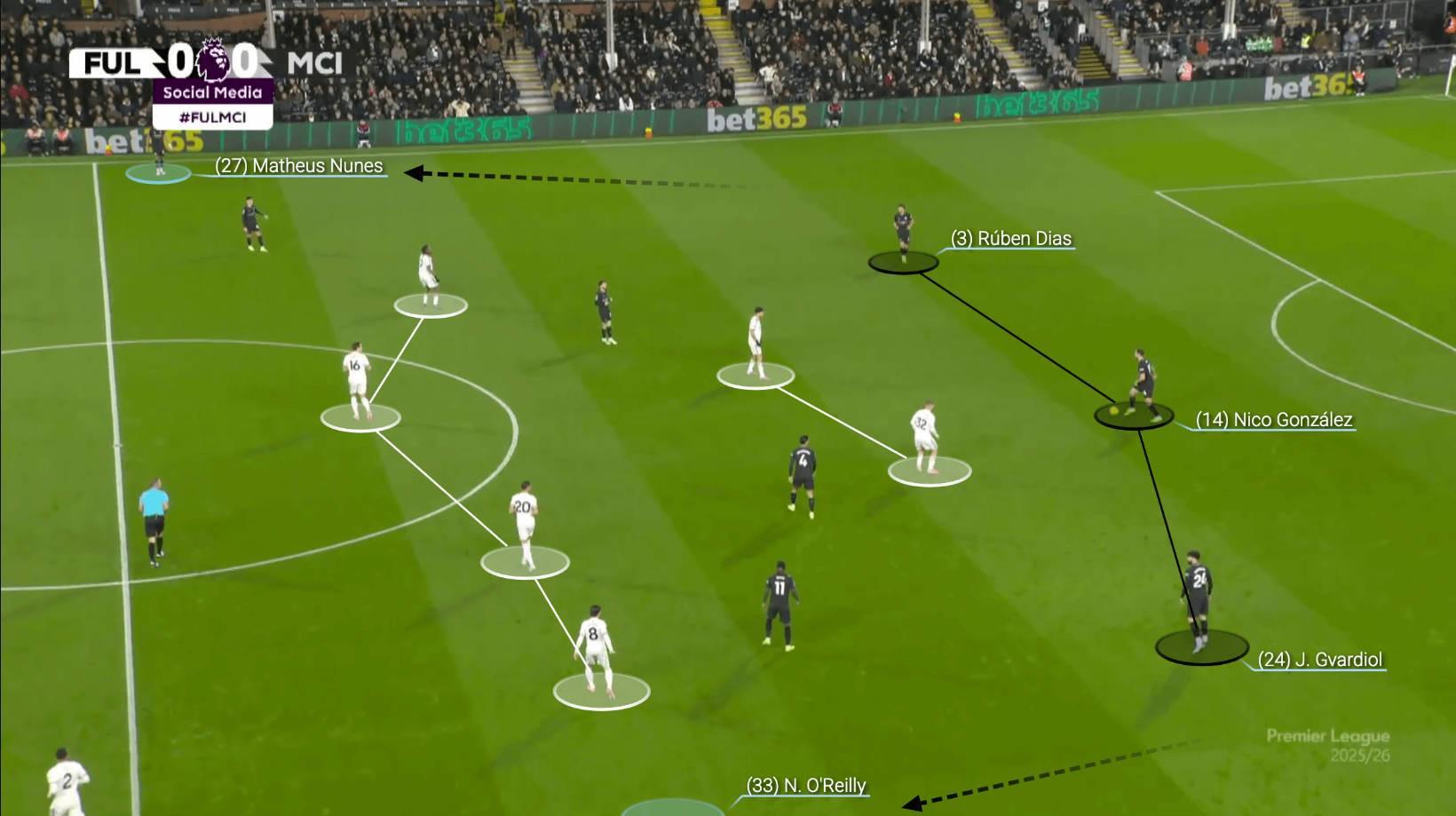 例如,在對陣富勒姆時,尼科-岡薩雷斯回撤組成三后衛(wèi)陣型,讓中后衛(wèi)分開,而邊后衛(wèi)則向前推進。