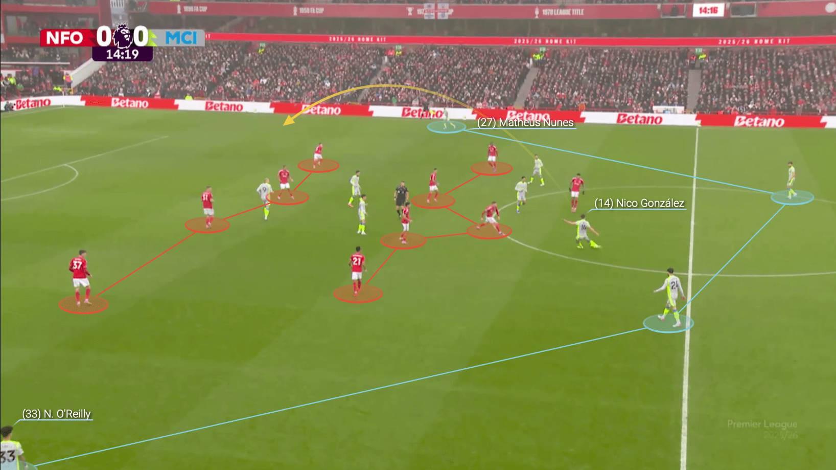 對陣諾丁漢森林時,曼城樂于通過直接的對角傳球找到邊后衛(wèi),利用寬度來繞過對方的4-5-1陣型。