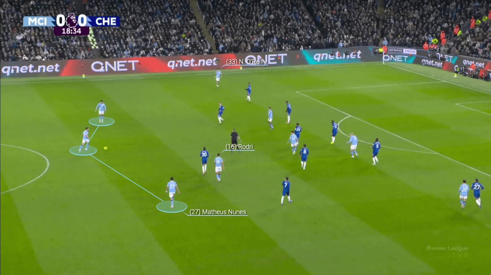 努內(nèi)斯被安排在另一側,曼城開始將邊后衛(wèi)用作解圍路線,拉開對手的防線,并進攻任何出現(xiàn)的空當。