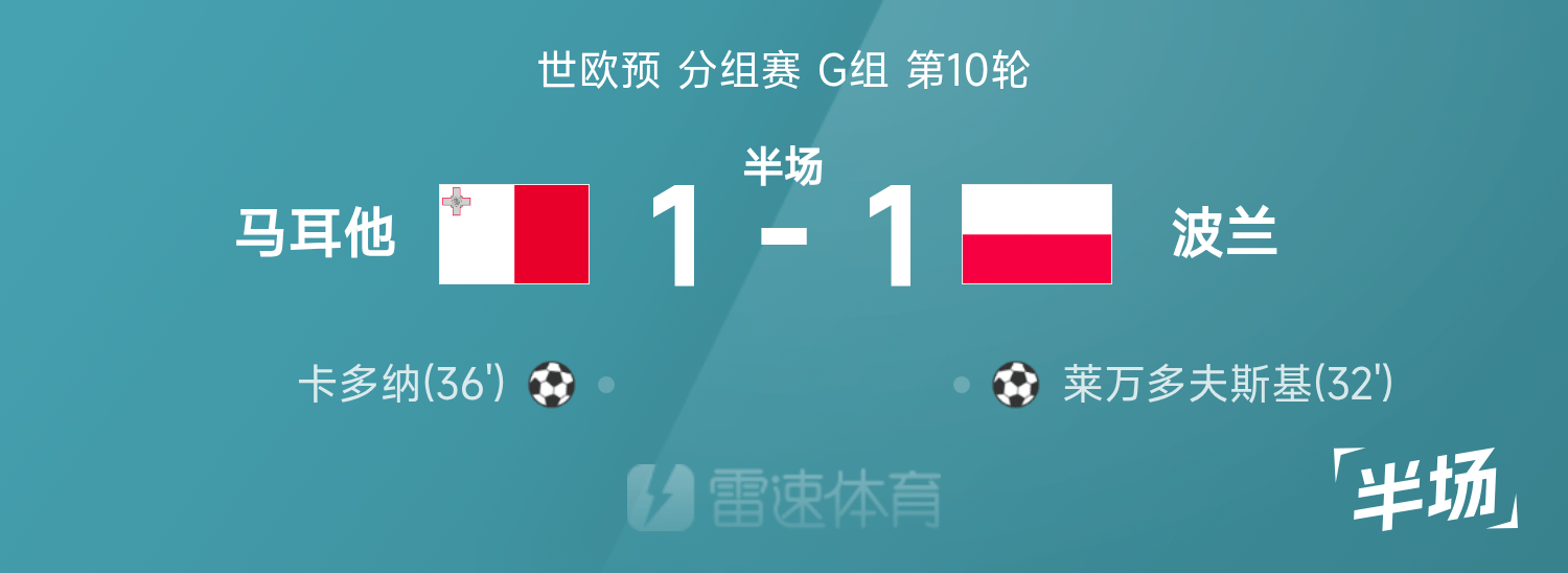 雷速體育11月18日訊 26賽季世歐預(yù)分組賽G組第10輪,馬耳他迎戰(zhàn)波蘭。半場(chǎng)戰(zhàn)罷,雙方比分暫為馬耳他1-1波蘭,萊萬(wàn)多夫斯基、卡多納破門(mén)建功。