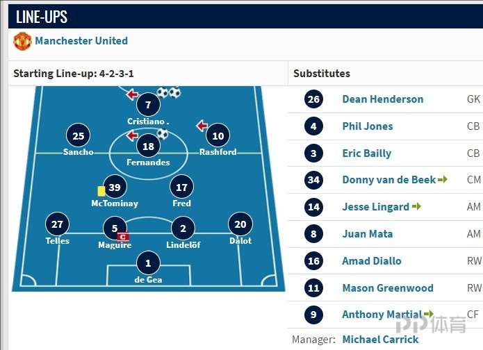 替補(bǔ)席則是:迪恩·亨德森、菲爾·瓊斯、拜利、范德貝克、林加德、馬塔、阿瑪?shù)?、格林伍德、馬夏爾。