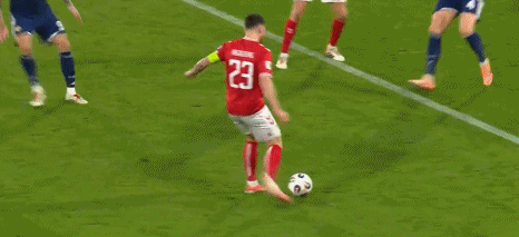 第29分鐘,丹麥開出角球,霍伊倫頭槌攻門稍稍偏出