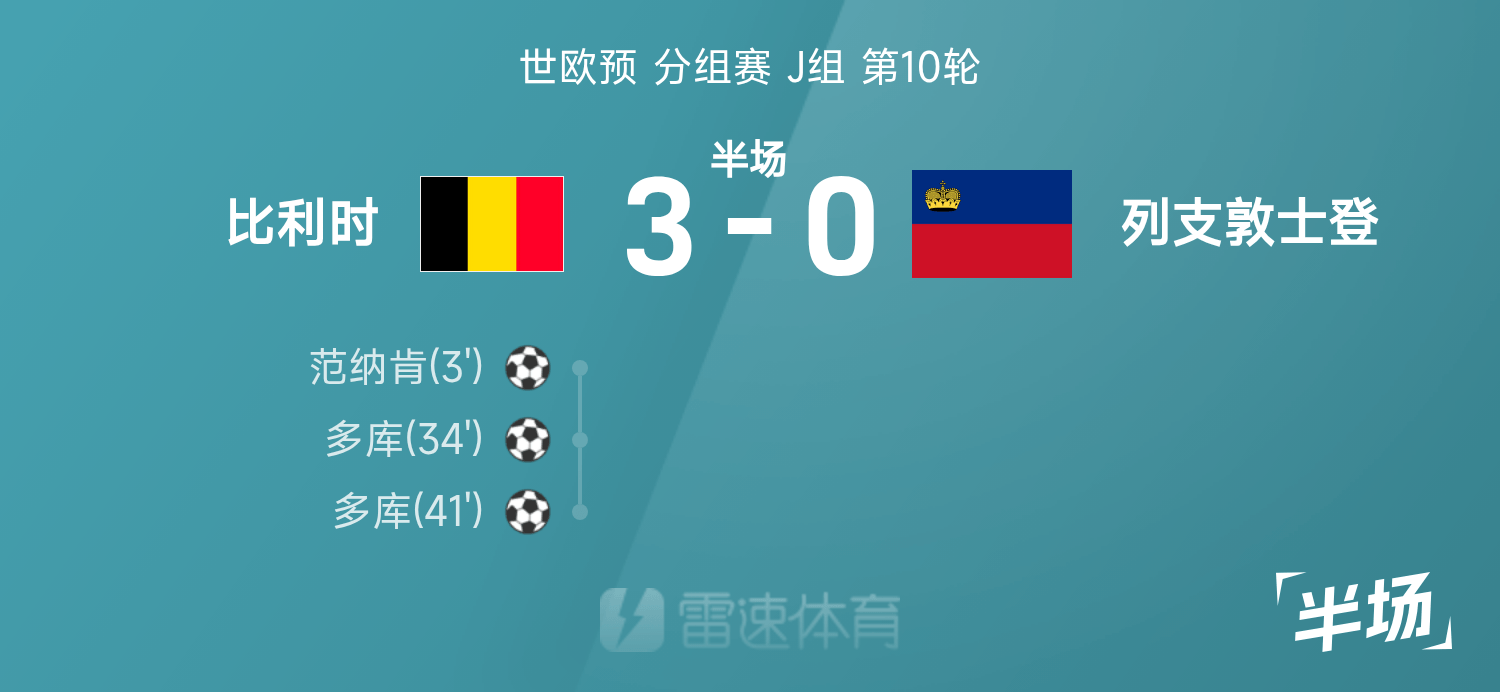 雷速體育11月19日訊 世歐預(yù)分組賽J組第10輪,比利時(shí)主場(chǎng)迎戰(zhàn)列支敦士登。此役上半場(chǎng),范納肯閃擊破門,多庫(kù)禁區(qū)中路迎球掃射破門隨即又帶球突入禁區(qū)抽射再入一球。半場(chǎng)戰(zhàn)罷,比利時(shí)3-0列支敦士登。