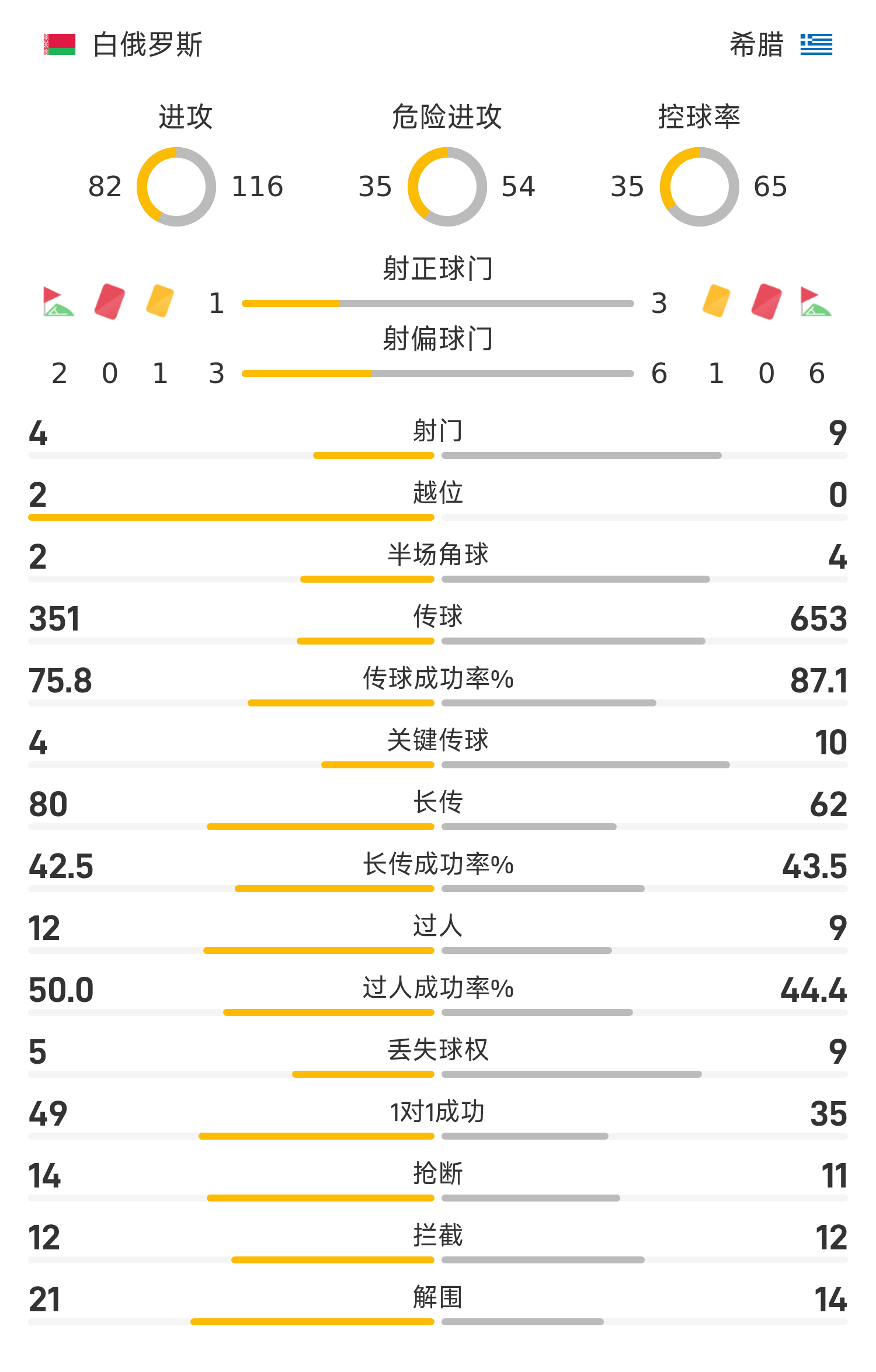 雷速體育11月19日訊 26賽季世歐預(yù)分組賽C組第10輪,白俄羅斯主場(chǎng)迎戰(zhàn)希臘。上半場(chǎng),馬蘇拉斯門前造險(xiǎn)但未取得進(jìn)球,雙方均無建樹。下半場(chǎng),斯佐利斯內(nèi)切射門中柱彈出。齊米卡斯、科斯托拉斯造險(xiǎn),均為取得進(jìn)球。最終,白俄羅斯0-0悶平希臘,雙方互交白卷握手言和。