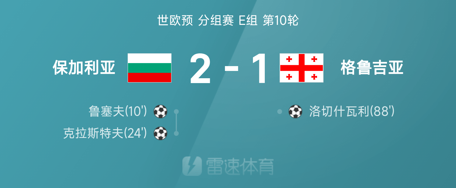 雷速體育11月19日訊 26賽季世歐預(yù)分組賽E組第10輪,保加利亞2-1戰(zhàn)勝格魯吉亞。上半場(chǎng)魯塞夫閃擊破門,克拉斯特夫再入一球擴(kuò)大領(lǐng)先優(yōu)勢(shì)。下半場(chǎng)結(jié)束前,洛切什瓦利扳回一城。最終,保加利亞主場(chǎng)2-1戰(zhàn)勝格魯吉亞。