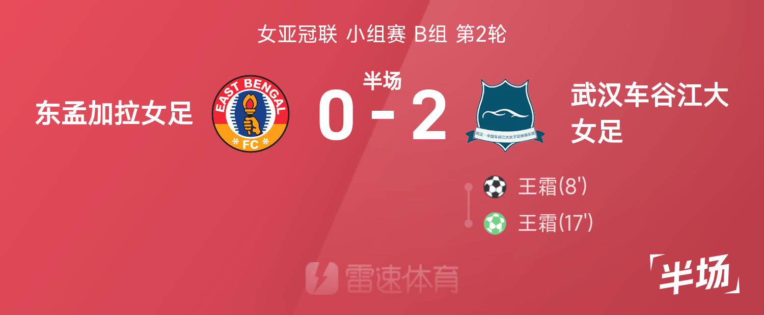 雷速體育11月20日訊 25/26賽季女亞冠聯(lián)小組賽B組第2輪,東孟加拉女足迎戰(zhàn)武漢車谷江大女足。半場戰(zhàn)罷,雙方比分暫為東孟加拉女足0-2武漢車谷江大女足,王霜上演梅開二度。