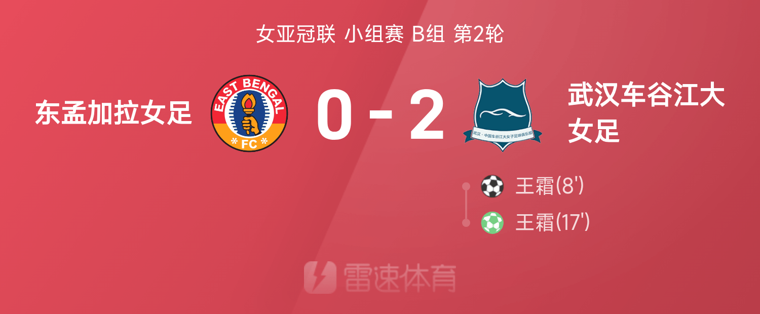 雷速體育11月20日訊 25/26賽季女亞冠聯(lián)小組賽B組第2輪,武漢車(chē)谷江大女足2-0戰(zhàn)勝東孟加拉女足,獲新賽季亞冠首勝,小組賽前2輪1勝1平。全場(chǎng)比賽,王霜上演梅開(kāi)二度。