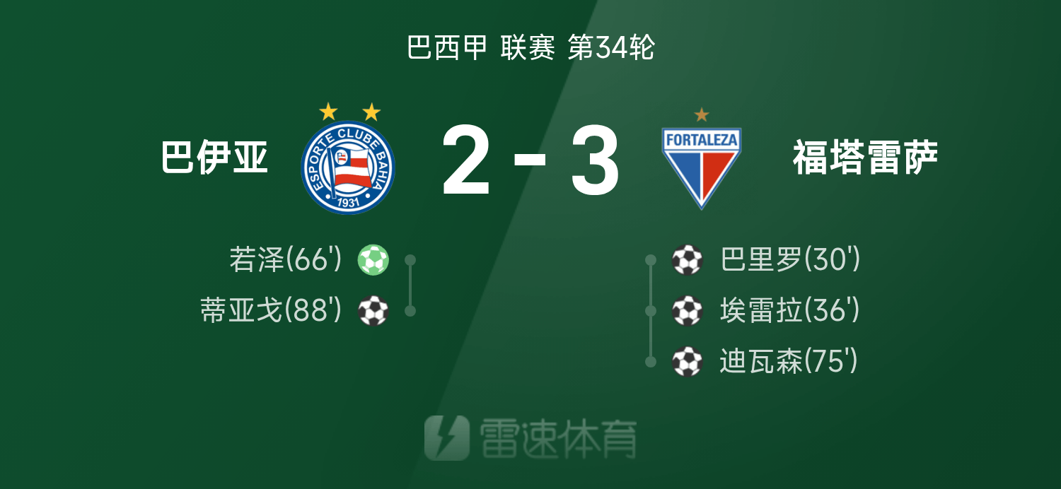 雷速體育11月21日訊 25賽季巴西甲聯(lián)賽第34輪,福塔雷薩3-2戰(zhàn)勝巴伊亞。全場(chǎng)比賽,埃雷拉發(fā)揮出色貢獻(xiàn)1射1傳,巴里羅、迪瓦森破門(mén)建功,若澤、蒂亞戈破門(mén)難救主。