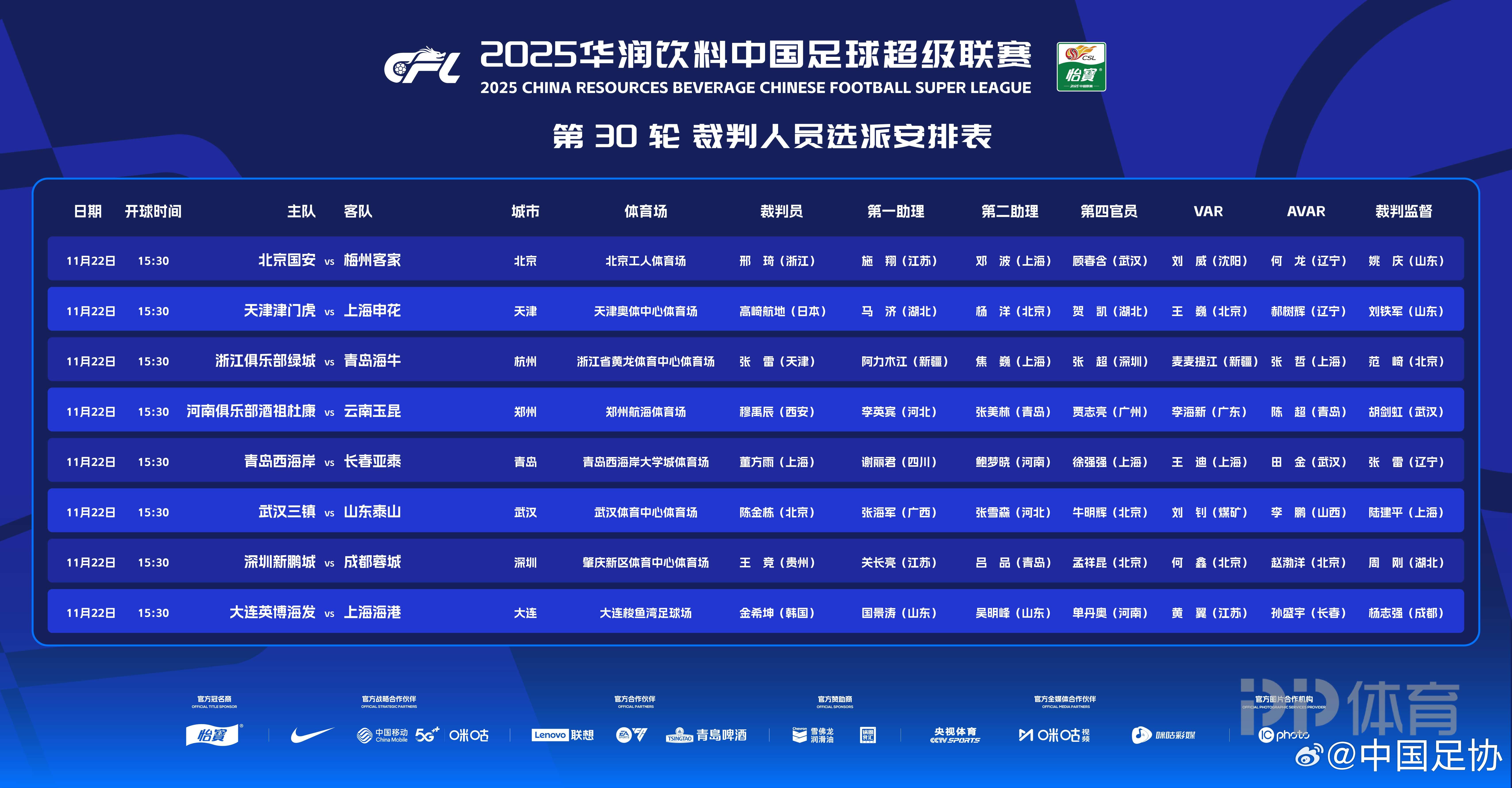 中超第30輪裁判安排: