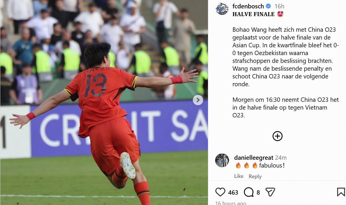 在U23亞洲杯中國戰(zhàn)勝烏茲別克斯坦的比賽中,王博豪罰入了制勝點球,助中國U23挺進半決賽。當?shù)貢r間1月19日,王博豪效力的荷乙鄧伯什俱樂部發(fā)文祝賀。
