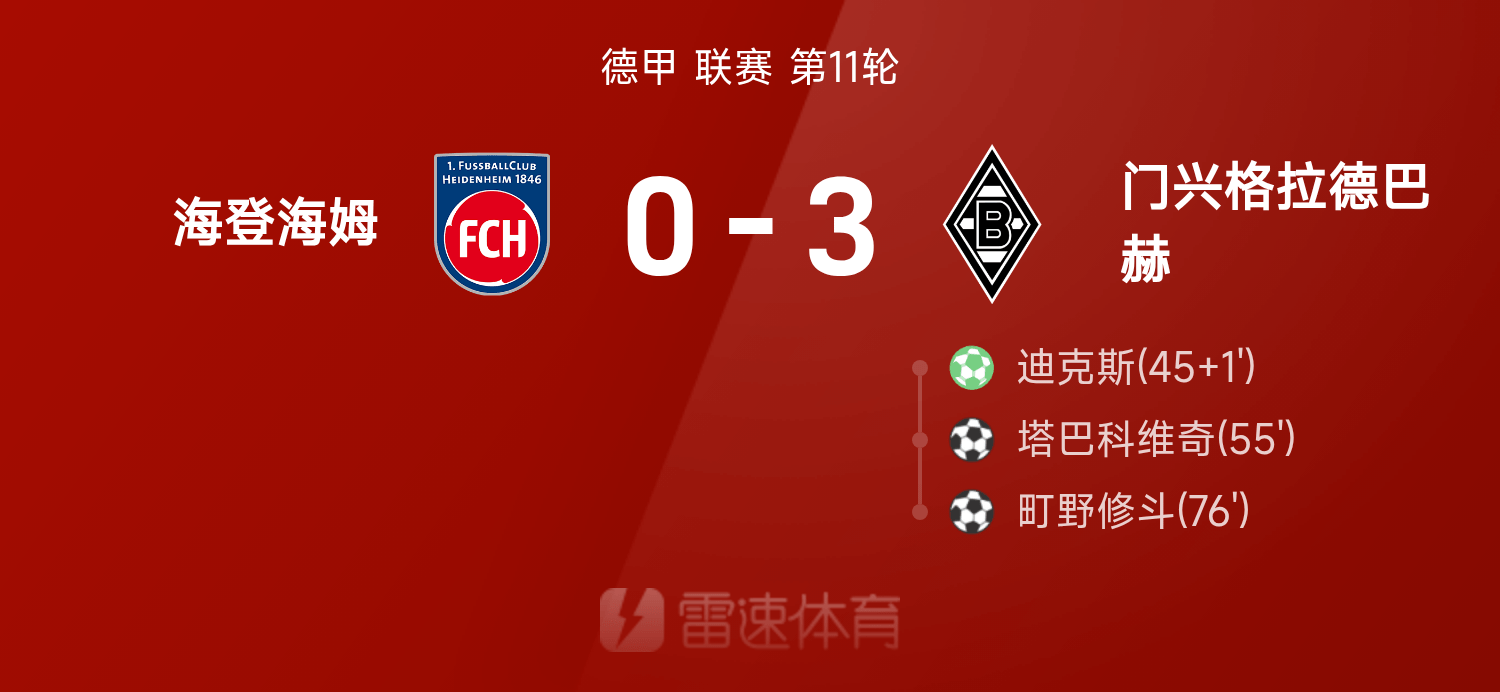 雷速體育11月23日訊 25/26賽季德甲聯(lián)賽第11輪,門興格拉德巴赫3-0戰(zhàn)勝海登海姆。全場比賽,町野修斗、迪克斯、塔巴科維奇破門建功。