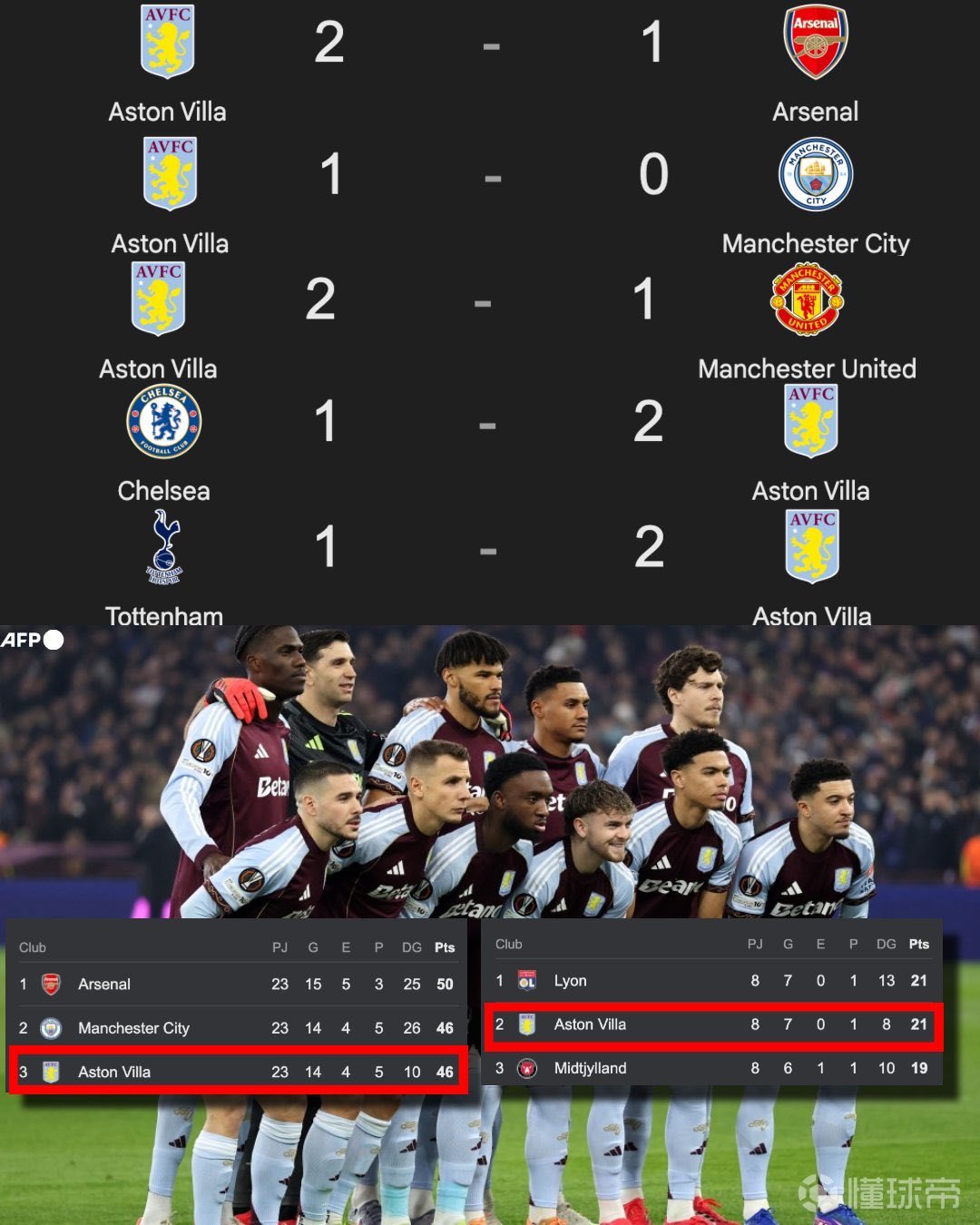 請(qǐng)全體起立,為阿斯頓維拉獻(xiàn)上掌聲!他們本賽季至今的表現(xiàn):? 穩(wěn)居英超聯(lián)賽前三名? 正直接爭(zhēng)奪英超冠軍? 歐聯(lián)杯小組賽挺進(jìn)前三? 直通歐聯(lián)杯十六強(qiáng)淘汰賽? 晉級(jí)足總杯第四輪? 已擊敗阿森納? 已擊敗曼城? 已擊敗曼聯(lián)? 已擊敗切爾西? 已擊敗熱刺他們屢克強(qiáng)敵,正在角逐世界頂級(jí)的聯(lián)賽冠軍;歐聯(lián)杯8場(chǎng)取得7勝;進(jìn)入二月仍保持三項(xiàng)賽事的爭(zhēng)冠可能!埃梅里打造了一支多么出色的球隊(duì)。英超乃至全英倫的熱門焦點(diǎn)!