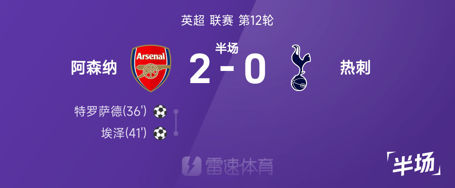 雷速體育11月24日訊 25/26賽季英超聯(lián)賽第12輪迎來北倫敦德比,阿森納迎戰(zhàn)熱刺。半場(chǎng)戰(zhàn)罷,雙方比分暫為阿森納2-0熱刺,特羅薩德打破僵局,埃澤再入一球。