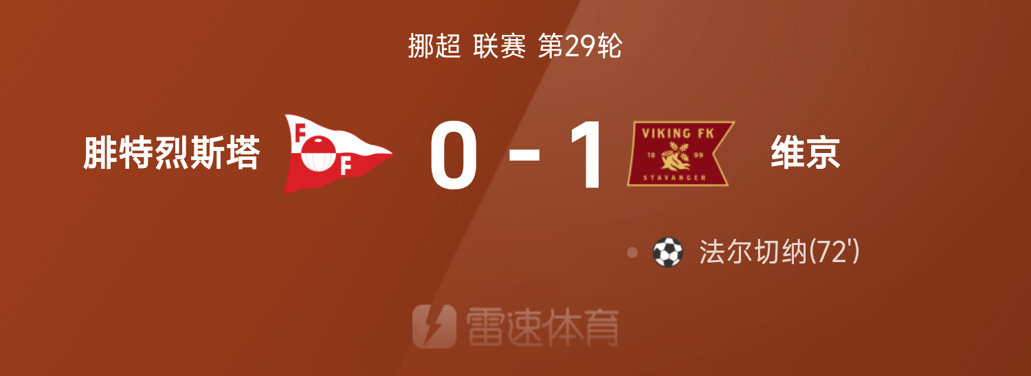 雷速體育11月24日訊 25賽季挪超聯(lián)賽第29輪,維京1-0戰(zhàn)勝腓特烈斯塔。上半場(chǎng)補(bǔ)時(shí)階段,斯科格沃爾德遠(yuǎn)射中柱,下半場(chǎng)波仙姆屢獻(xiàn)神撲,但法爾切納頭球破門一錘定音。最終,維京客場(chǎng)1-0小勝腓特烈斯塔,球隊(duì)領(lǐng)先博德閃耀1分,重回積分榜首位。