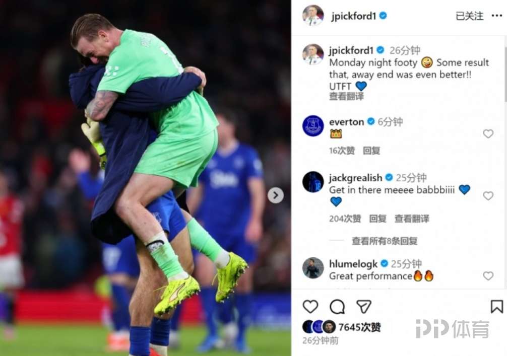 皮克福德社媒曬出慶祝的照片,配文:“周一足球之夜,這樣的結(jié)果太棒了,客場(chǎng)看臺(tái)的氛圍更是無(wú)敵,加油埃弗頓!”