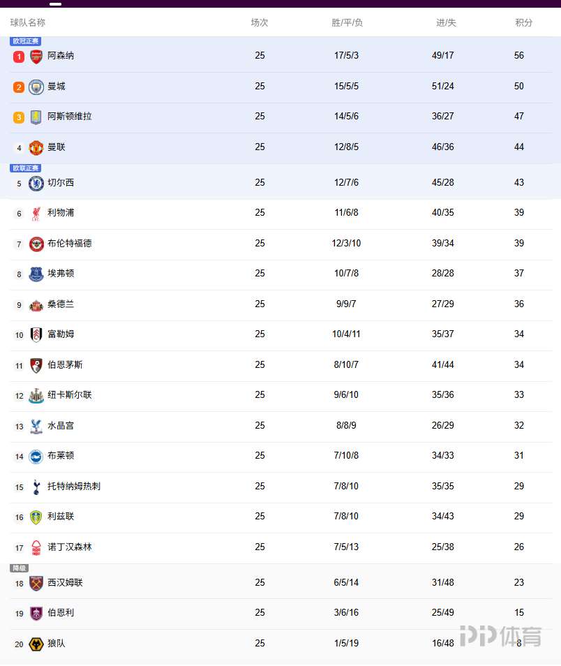 英超第25輪,利物浦1-2曼城。至此本輪英超所有比賽均已結(jié)束!最新的積分榜形勢如下: