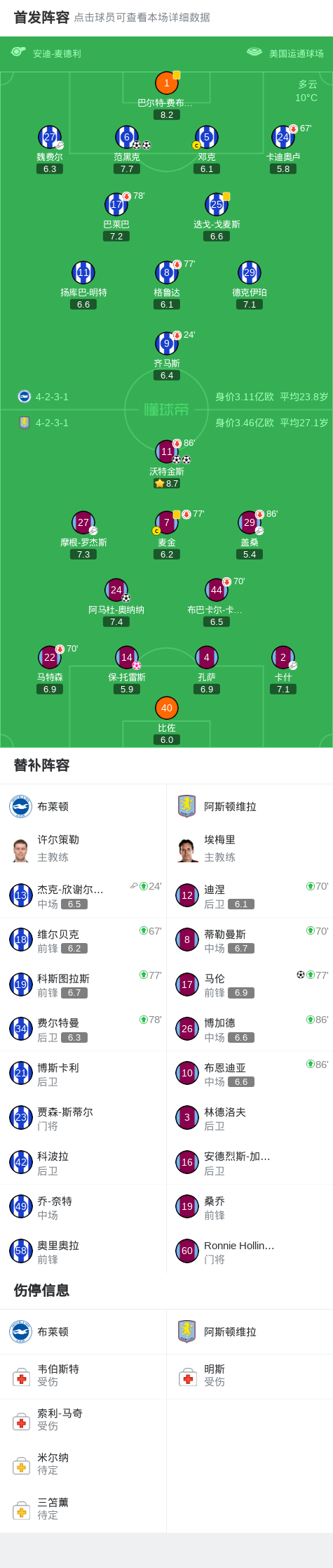 第37分鐘,馬特森橫掃門前,沃特金斯包抄打進(jìn)扳回一球!布萊頓2-1維拉