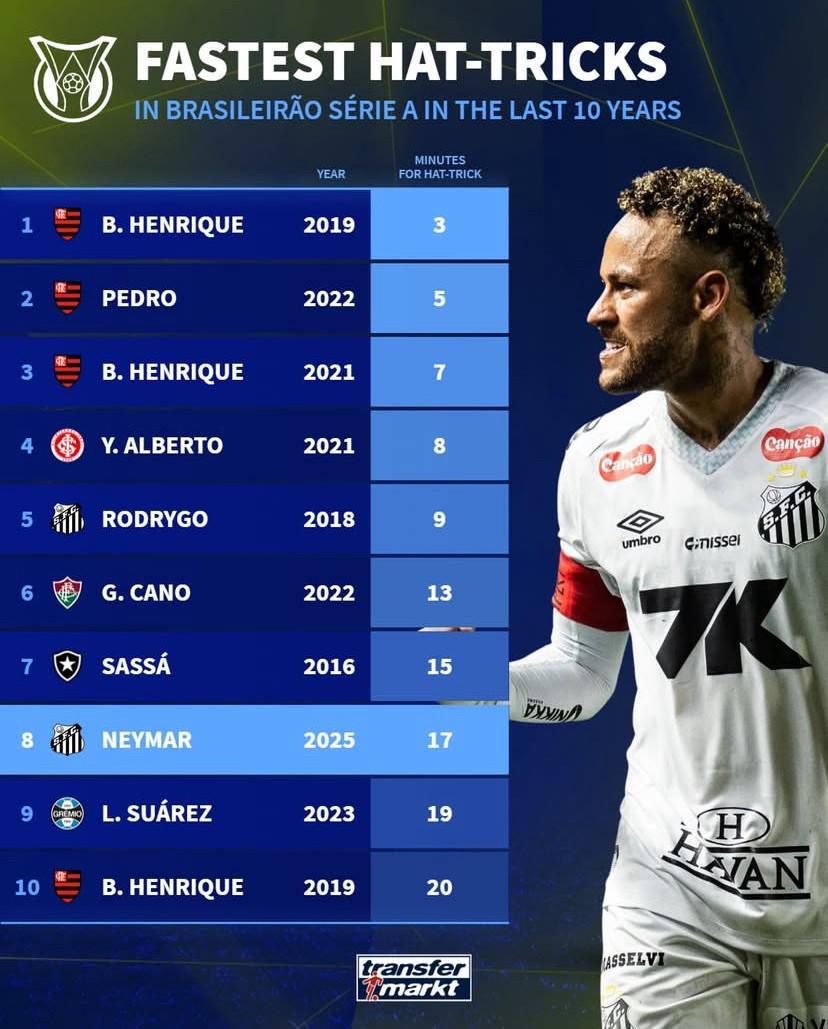 北京時(shí)間12月4日,內(nèi)馬爾在17分鐘內(nèi)完成的帽子戲法幫助桑托斯在巴甲第37輪的比賽中客場3-0擊敗了尤文圖德,贏下了保級的關(guān)鍵戰(zhàn)役,賽后德轉(zhuǎn)統(tǒng)計(jì)出了巴甲近10年最快帽子戲法TOP10,內(nèi)馬爾排名第8,羅德里戈和蘇亞雷斯上榜。