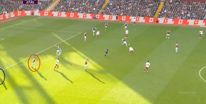 所以在第28分鐘,阿斯頓維拉完成搶斷之后,發(fā)動了左路的進攻,一腳傳中打到禁區(qū)內,便來到了后點的卡什腳下:
