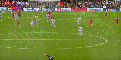 第60分鐘,薩拉赫角球助攻,?;倏祟^球完成梅開二度!利物浦2-0領(lǐng)先布萊頓